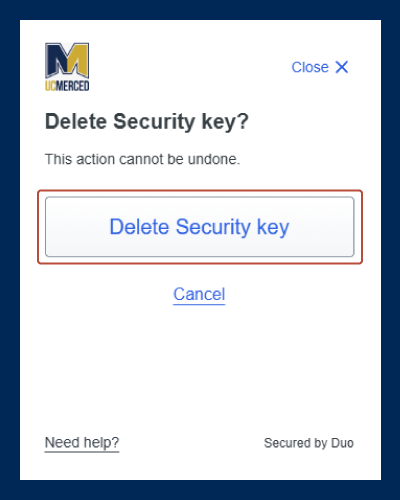 On the confirmation prompt, select "Delete (device name)." This will remove the device as an authentication method for Duo.