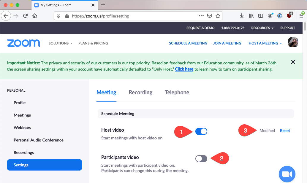 Anyone can change the default settings for their Zoom account. Changing these settings will set the new settings for which all meetings will default to. Settings for individual meetings can be changed on a meeting-by-meeting basis if desired. Go to: https://ucmerced.zoom.us/profile/setting and log in with your UC Merced account if not already logged in. 1. Setting is on 2. Setting is off 3. Setting has been changed from the default. Click “Reset” to return the setting to its default state. |