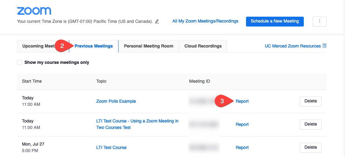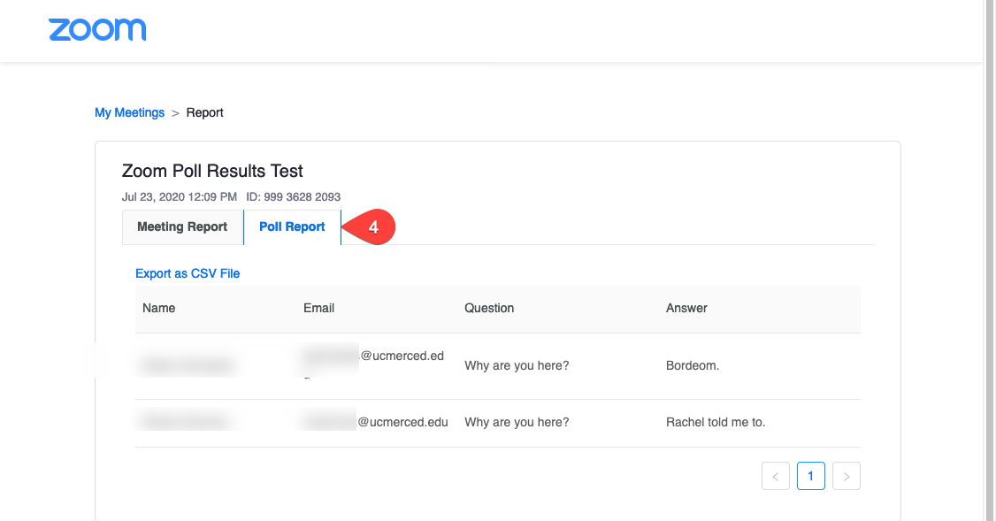 1. When the meeting is over, go back to your course in CatCourses and click on the Zoom navigation item. 2. Click on "Previous Meetings". 3. Click on "Report" next to the meeting you want to see the poll results for. 4. Click on "Poll Report". You'll be able to view the responses of the poll as well as download an excel file with responses by clicking on "Export as CSV File". |