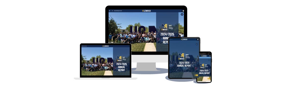 Submitted by jgarcia571 on Nov. 19, 2025 OIT is pleased to announce the digital publication of our 2024/2025 Annual Report. Click through the report to learn more about OIT's role and commitment in supporting technologies at UC Merced here. Link: https://uc-merced.foleon.com/general/oit-annual-report-2425/Weight: 5Slider Type: Front Page