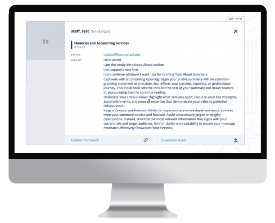 Did you know, within the Campus Directory there is an about me section? Let students know how you prefer to be contacted, your duties and responsibilities here on campus, or just a fun fact about yourself. An updated and filled out directory card can help students and other faculty & staff identify how you can best support them and vice versa.